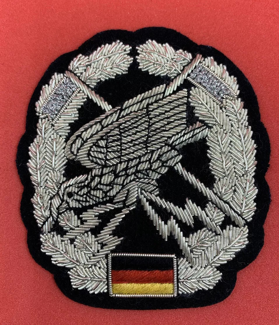 The German Army Special Reconnaissance Badge is a hand-embroidered emblem made with bullion and wire. It represents the elite status of special reconnaissance units, adding a distinctive touch to uniforms or collections.