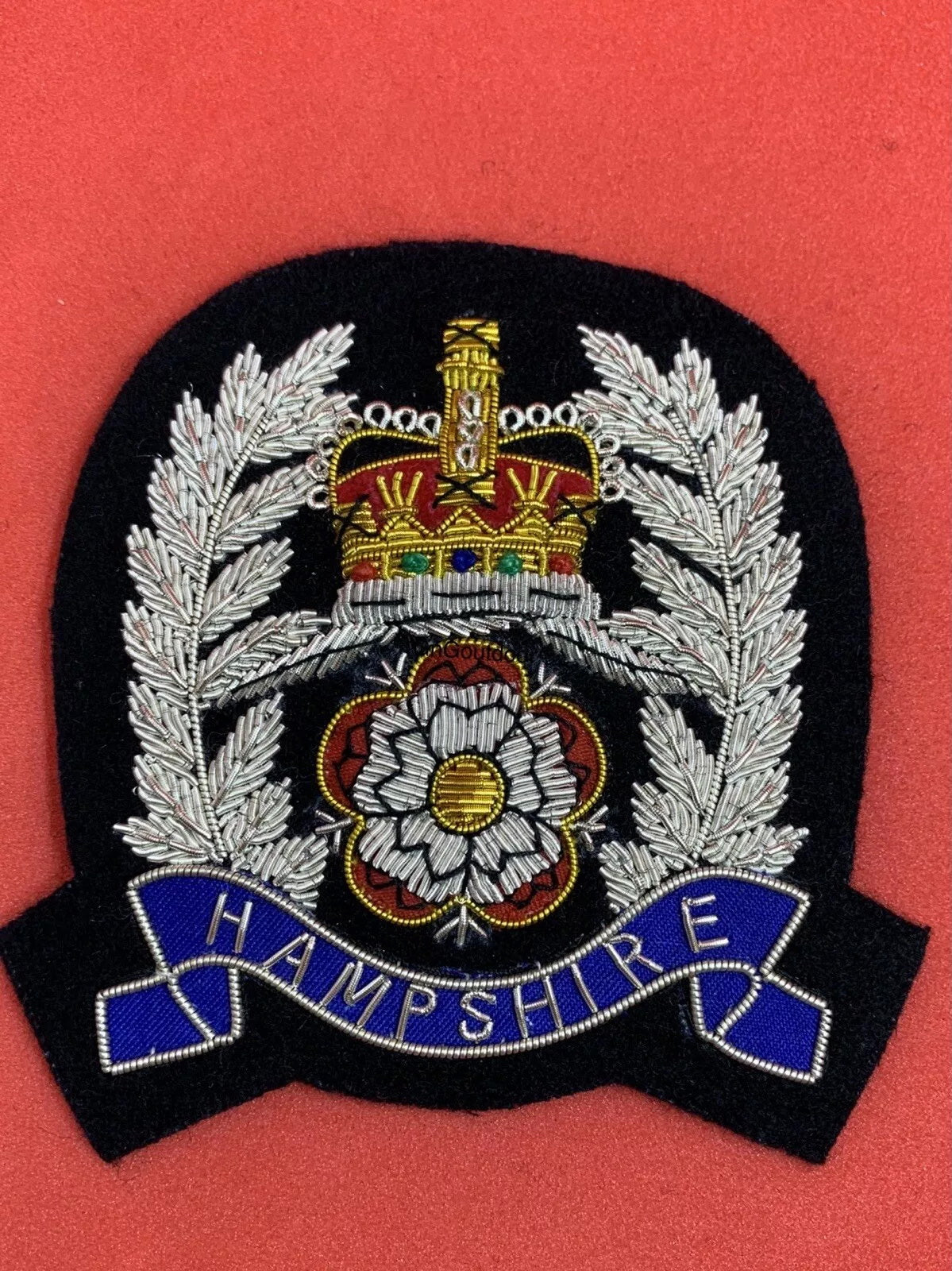The Hampshire Police Blazer Badge is a hand-embroidered bullion wire replica, expertly crafted to mirror the official insignia. Ideal for collectors or uniform enhancement, this badge offers an authentic and distinguished look.