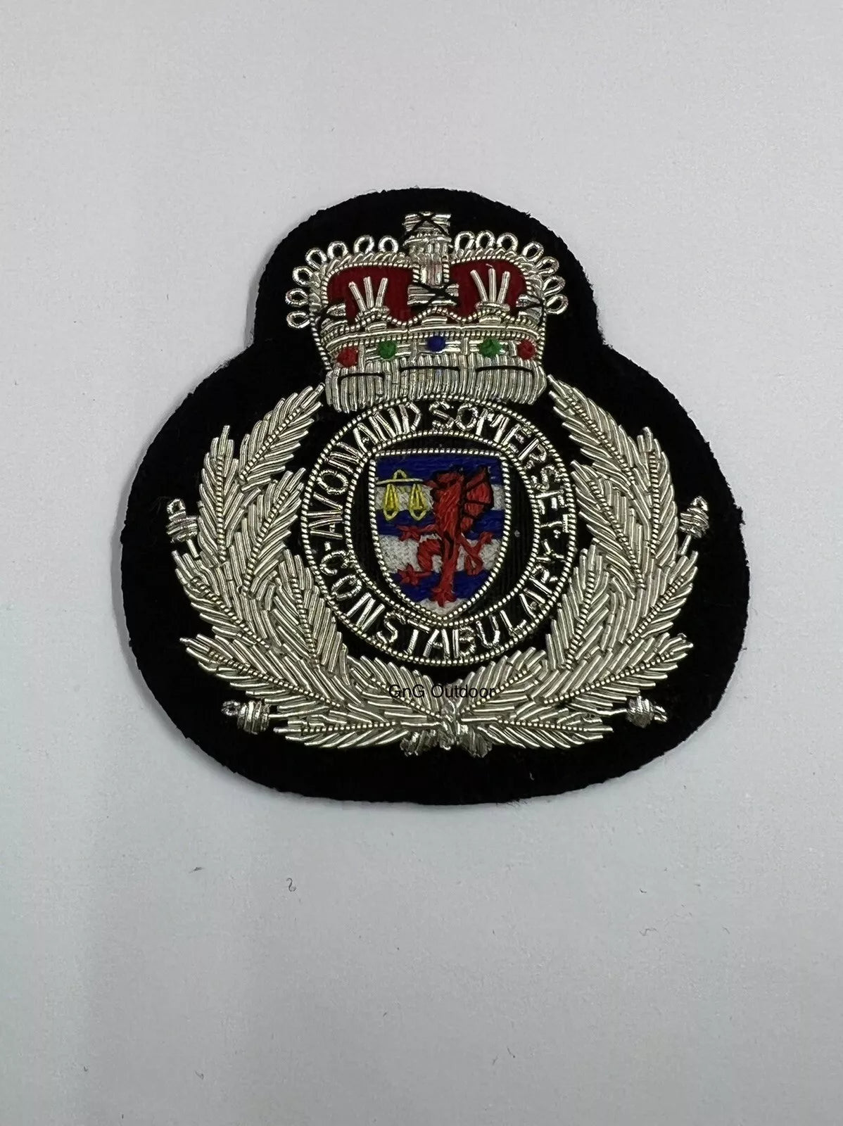 The Avon and Somerset Hat Badge is an embroidered bullion wire replica of the official police insignia. Designed for caps, it adds an authentic and distinguished touch to police uniforms or collections.