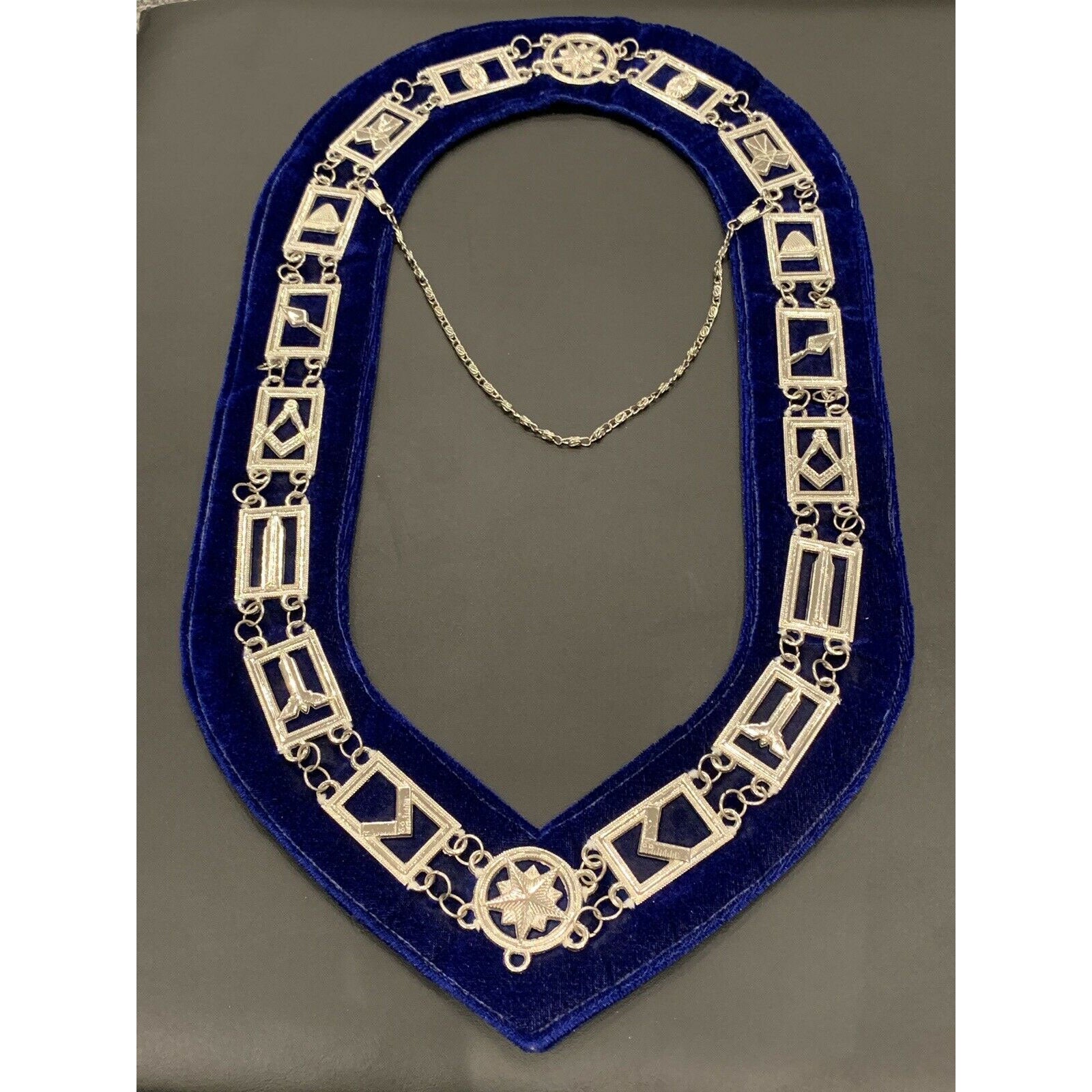 Masonic Master Mason Silver Chain Collar On Blue Velvet Masonic Metal Collars.
