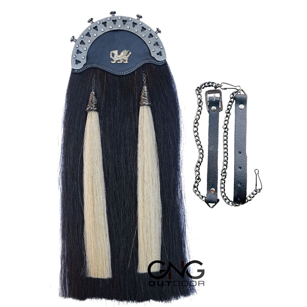 Scottish Black Horse Hair Sporran is a traditional accessory with formal Highland dress. Made from white horse hair, it symbolizes Scottish heritage and craftsmanship. The sporran, a pouch worn at the front of the kilt, is adorned with horse hair, which is often braided or twisted into intricate designs. The Black Horse Hair Sporran with two White Tassels is a striking addition to any Highland outfit, representing a connection to Scotland's rich history and cultural traditions. Its unique beauty and significance make it a cherished accessory among Scots and Highland dress enthusiasts alike.