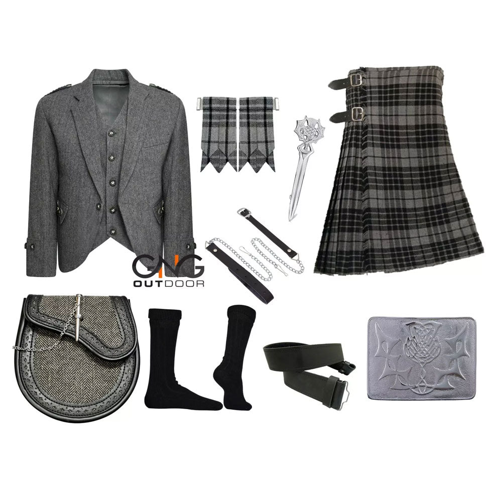 Men's Scottish Grey Tweed Jacket Wedding Kilt Outfit Jacket 8 Pieces Kilt Outfit