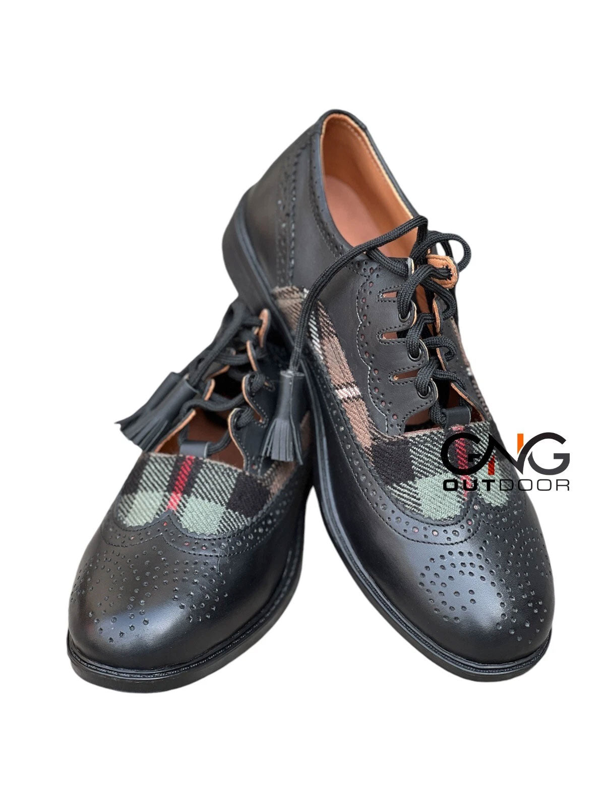 Men's Scottish Tartan Shoes Ghillie Brogues Black Leather Kilt Shoes
