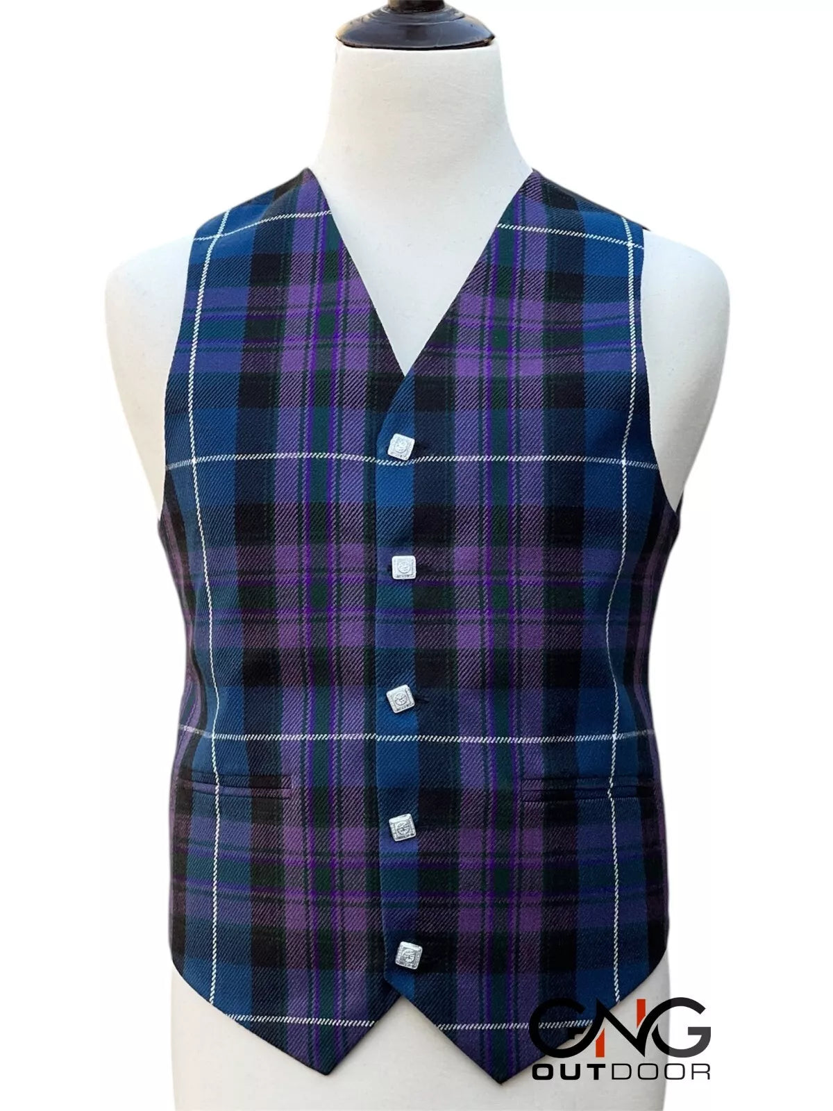 The Pride of Scotland Tartan waistcoat, also known as a kilt vest or wedding vest, is a timeless piece of Scottish Highland attire. This sleeveless jacket, traditionally crafted from vibrant tartan fabric, adds a touch of heritage and individuality to any ensemble.