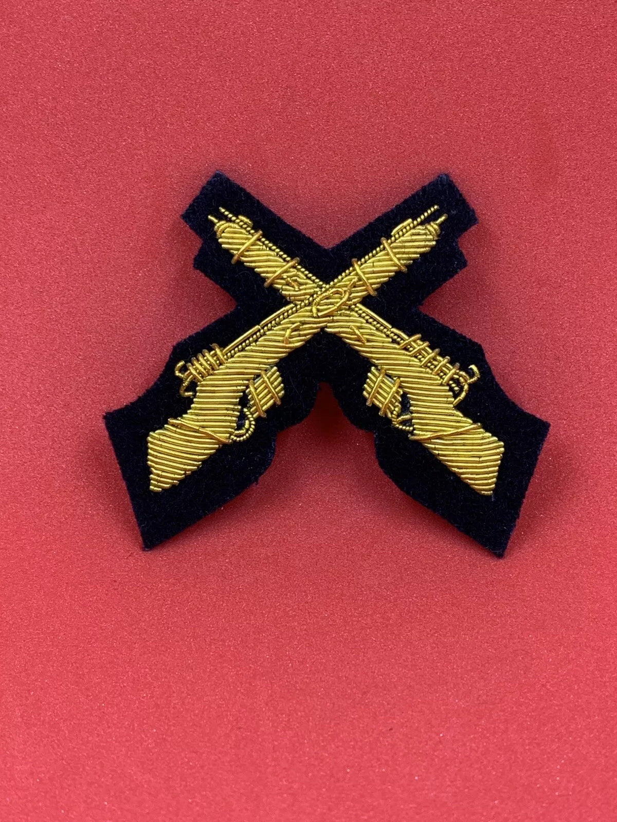 This exquisite piece of cloth hand-embroidered badge is a must-have for collectors of militaria. The badge features a gold crossed rifle design on a black background, perfect for those who appreciate the artistry of British military uniforms. The badge is designed to be worn on Mess Dress jackets, making it an ideal addition for those who are looking to complete their uniform collection.