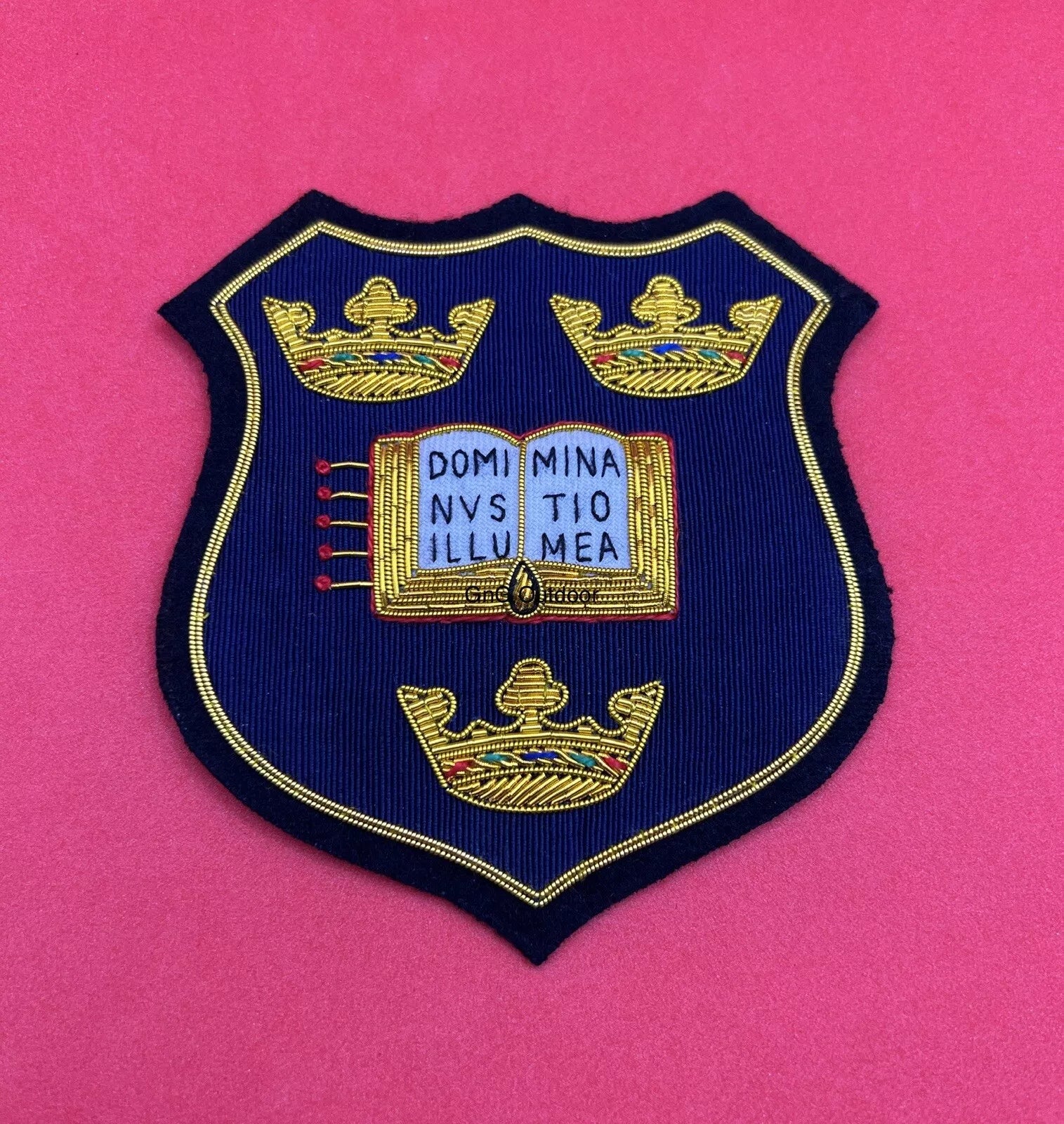 Enhance your blazer with this hand-embroidered Oxford University badge. Featuring exquisite bullion and wire work, this elegant badge showcases the university’s prestigious crest with intricate detail. Ideal for adding a touch of academic distinction.