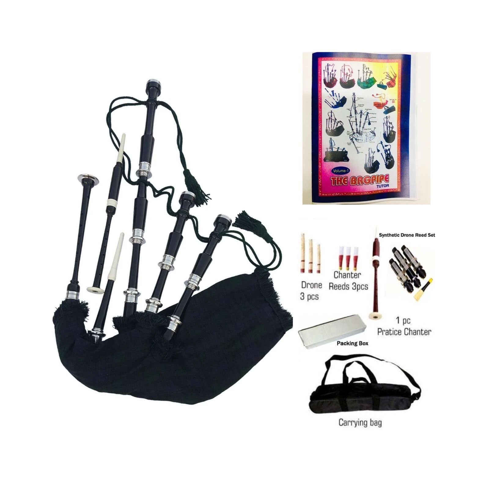 Plain Black Bagpipe Black Watch Tartan Silver Mounts Rosewood Highland Bagpipe