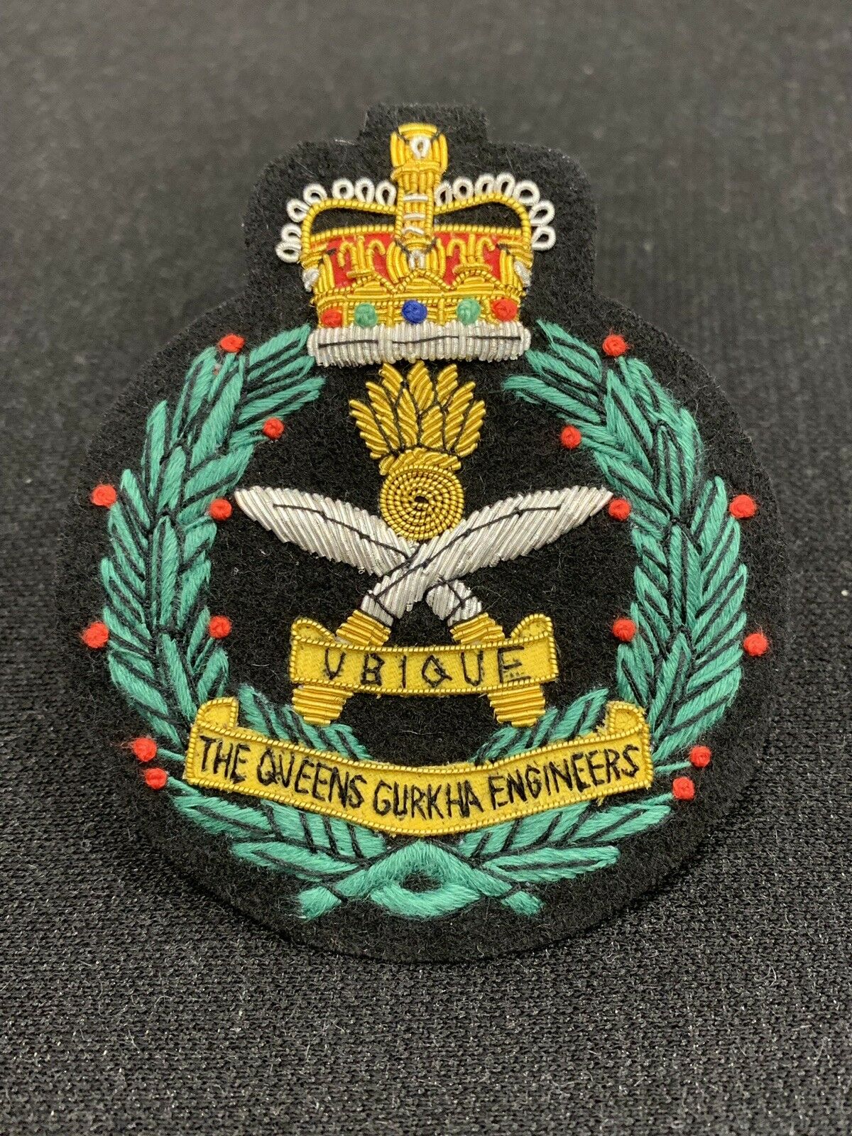 Handmade on black felt with gold/silver bullion and wire