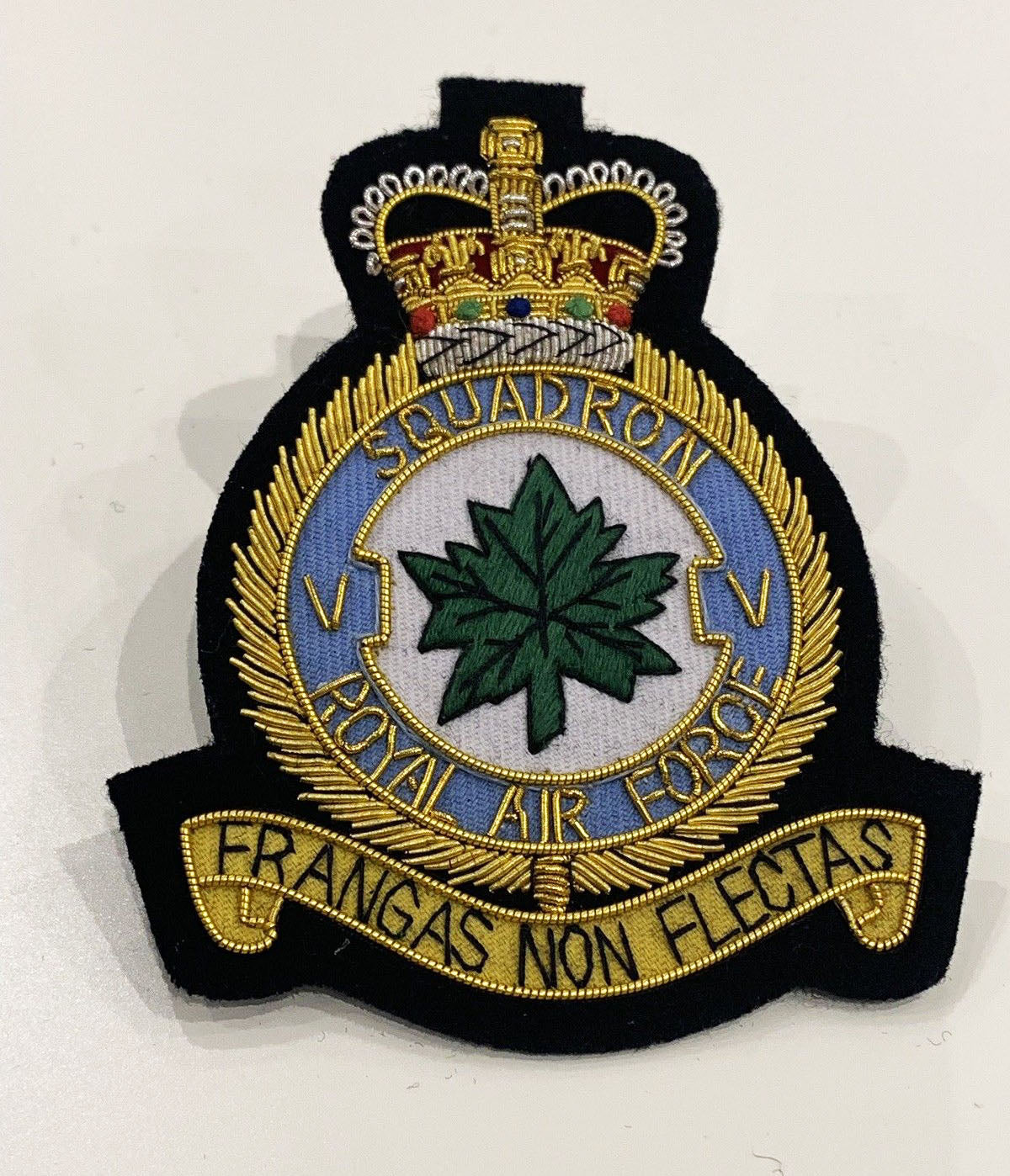 Hand Embroidered RAF V squadron blazer badge made with gold and silver bullion, padded backing
