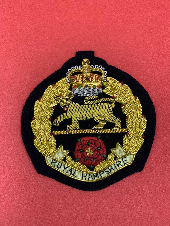 The Royal Hampshire Regiment Blazer Badge is a hand-embroidered bullion and wire emblem. It represents the Royal Hampshire Regiment, adding a distinguished and elegant touch to any blazer.