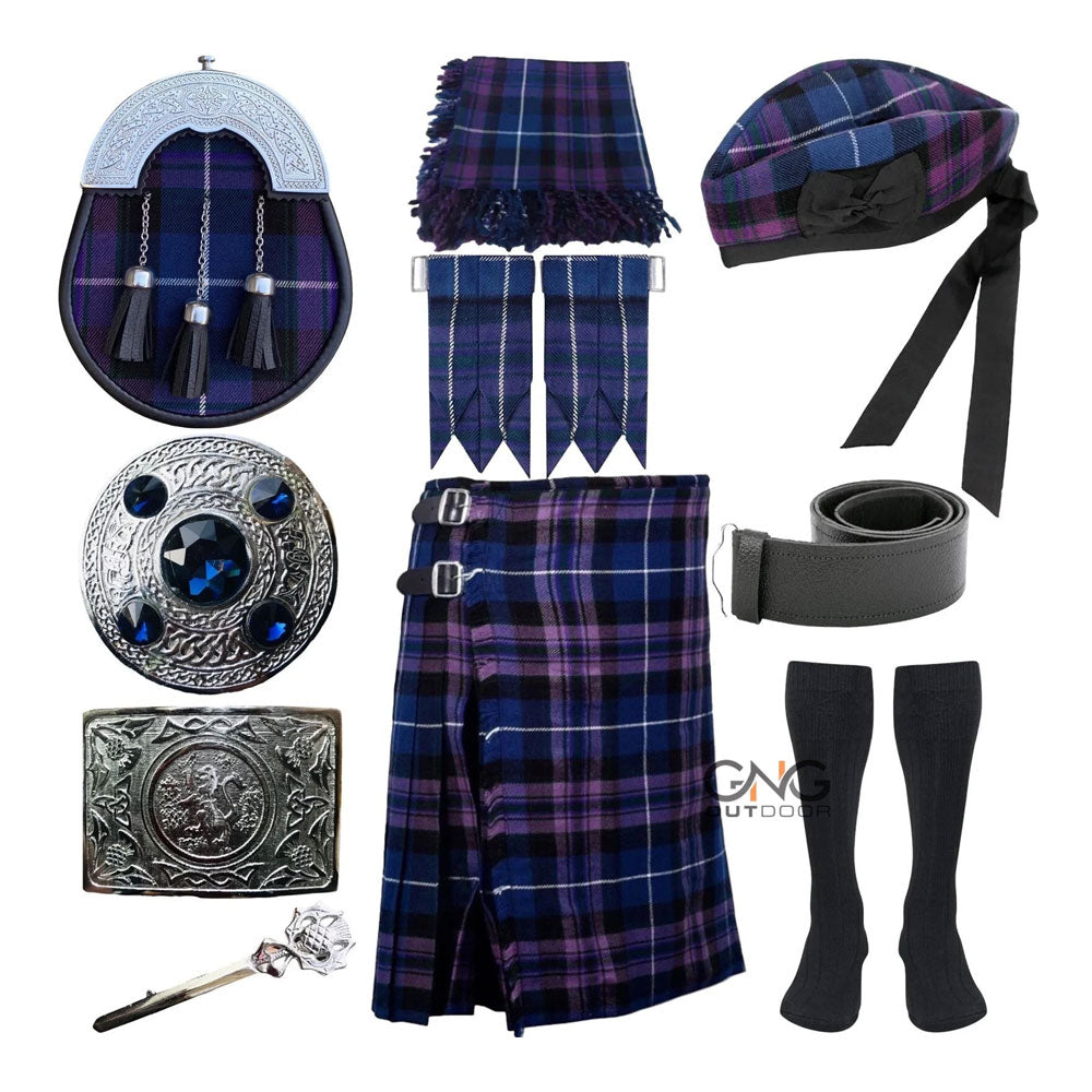 Scottish Men's 10 Pieces Tartan Sporran Kilt Outfit Wedding Kilt Set with Hat