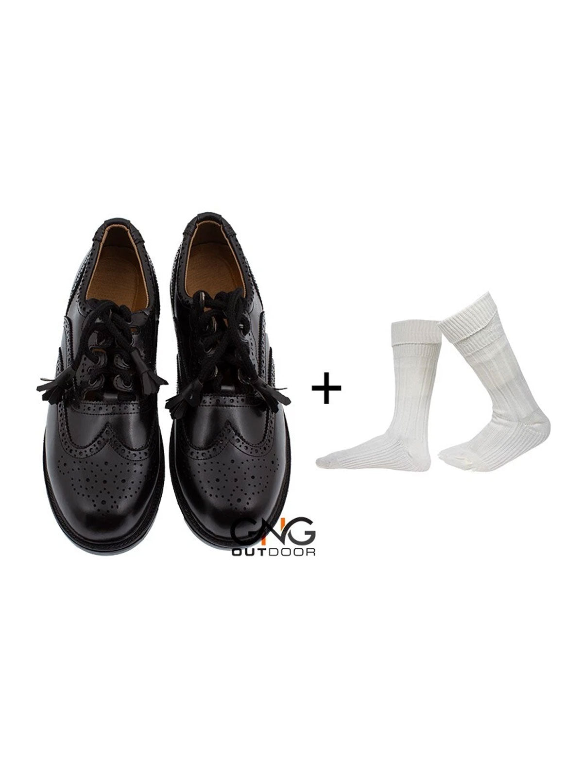 Scottish Men's Black Leather Ghillie Brogues Kilt Shoes with Cream Socks