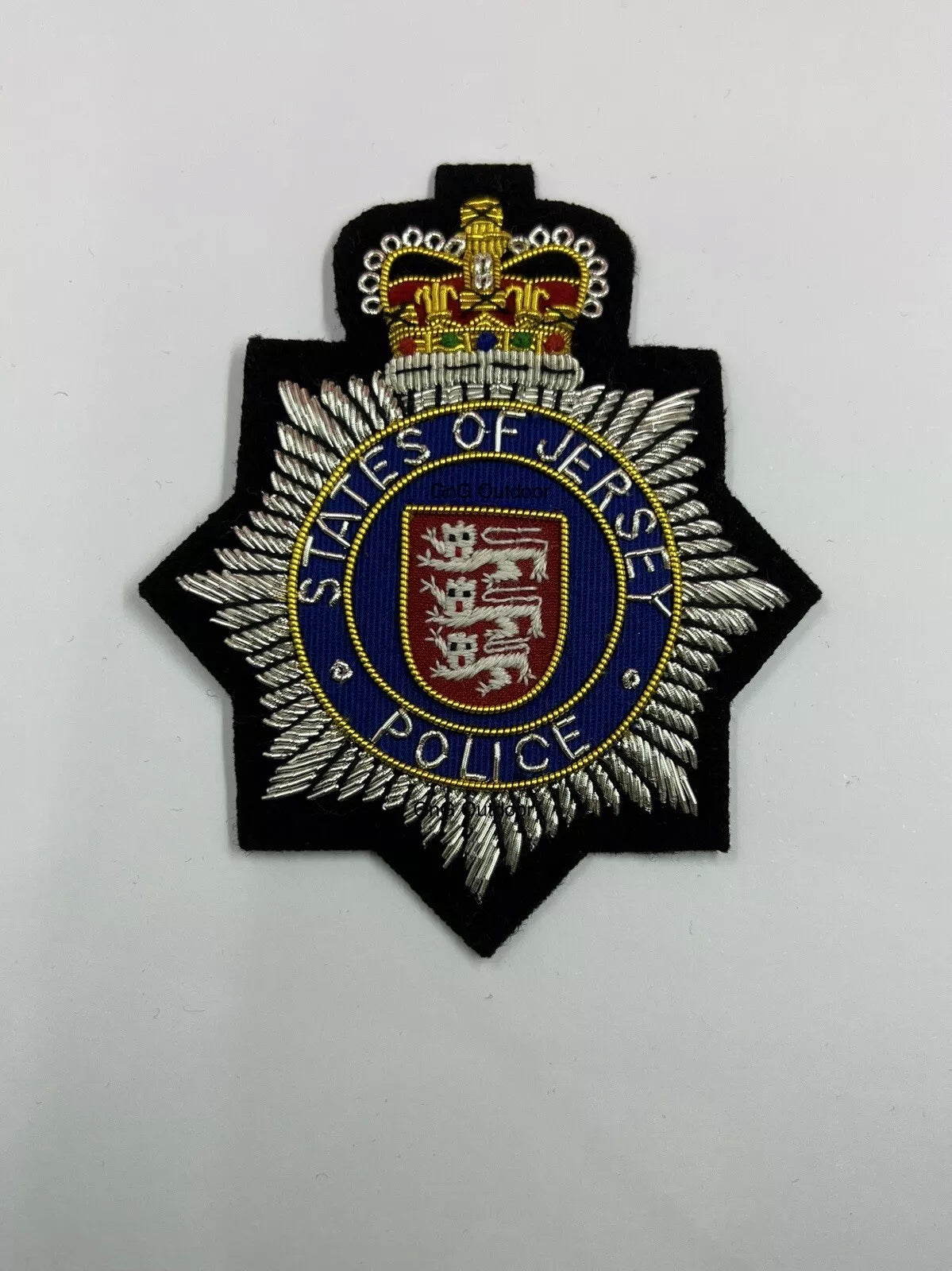 The State of Jersey Police Blazer Badge is a finely embroidered, handcrafted piece made with bullion wire. Ideal for police memorabilia collectors, it represents the distinguished service of the State of Jersey Police and adds a touch of prestige to any collection or attire.