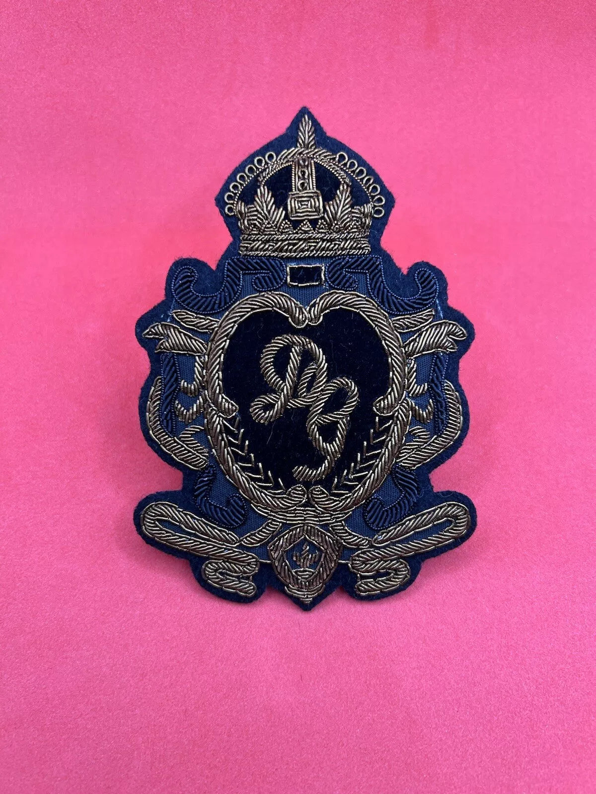This rustic blazer badge features vintage-style hand embroidery with bullion and wire. Ideal for adding a classic touch to your jacket, it combines timeless craftsmanship with a distinguished look.